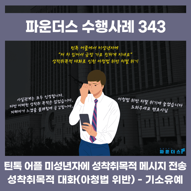 의뢰인이 전송한 채팅은 단순한 내용으로 보이지만 어플 특성상 상대의 나이가 노출되며 이를 알고도 메시지를 전송한 점에 있어 성착취 목적으로 접근하여 성적 대화를 시도했다 볼 가능성이 높아 엄중한 처벌이 예상되었습니다.