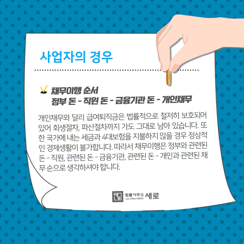 개인채무와 달리 급여퇴직금은 법률적으로 철저히 보호되어 있어 회생절차, 파산절차까지 가도 그대로 남아 있습니다. 또한 국가에 내는 세금과 4대보험을 지불하지 않을 경우 정상적인 경제생활이 불가합니다. 따라서 채무이행은 정부와 관련된 돈 - 직원, 관련된 돈 - 금융기관, 관련된 돈 - 개인과 관련된 채무 순으로 생각하셔야 합니다.