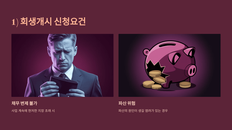 채무자는 사업 계속에 현저한 지장이 생기거나 파산 원인이 될 우려가 있을 때 회생절차 개시를 신청할 수 있으며, 이는 법인뿐 아니라 개인도 가능하다. 개인의 경우 일정 채무 한도 내에서 간편한 개인회생절차를 선택할 수 있다.