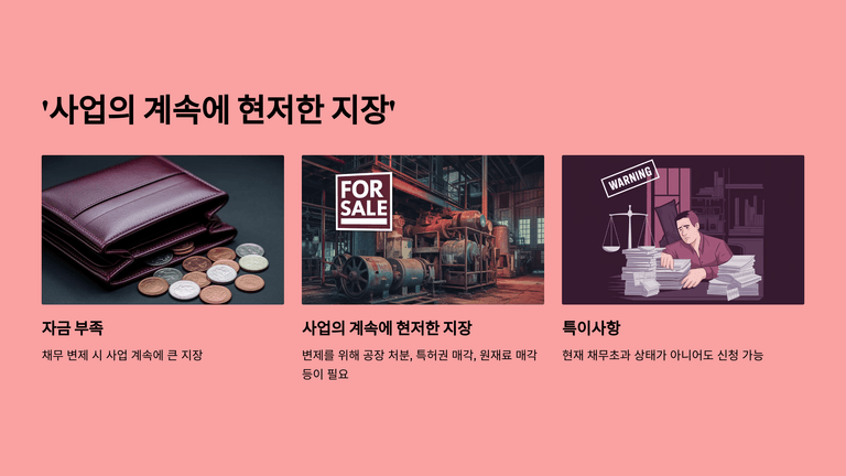 ‘사업 계속에 현저한 지장’은 자금 부족으로 변제가 사업 유지에 심각한 문제를 일으키는 상황을 의미하며, 이는 지급불능과는 구분된다. 따라서 반드시 현재 채무초과 상태일 필요는 없다.