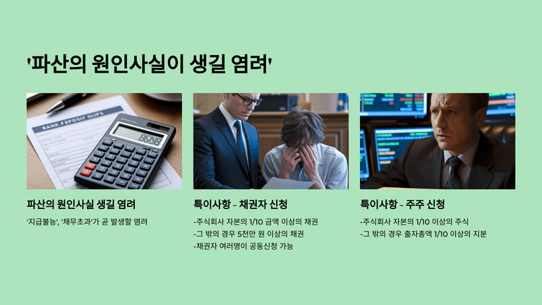 ‘파산 원인 발생 염려’는 아직 지급불능이나 채무초과 상태가 아니지만 곧 발생할 우려가 있는 경우로, 이때는 채무자뿐 아니라 일정 규모 이상의 채권자나 주주도 개시 신청이 가능하다.