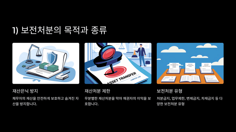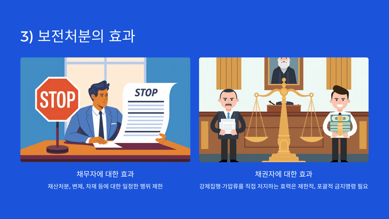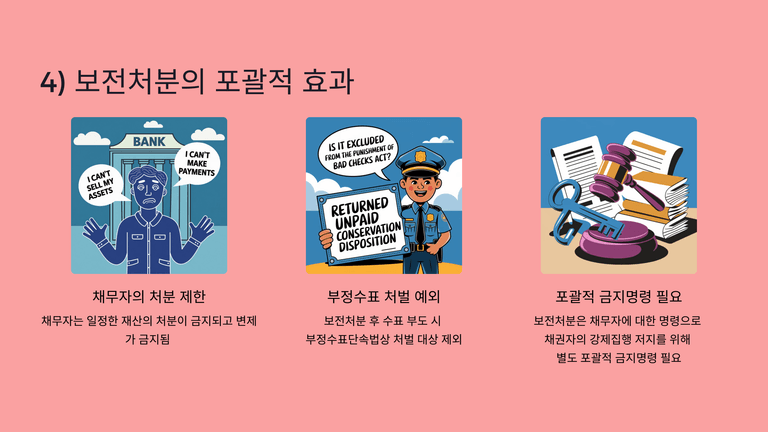 보전처분은 채무자에 대한 제한으로 채권자의 강제집행·가압류를 막지 못하므로, 강제집행 방지를 위해서는 포괄적 금지명령도 함께 신청해야 하며, 보전처분 이후 부도 수표는 부정수표단속법 처벌 대상이 아니다.