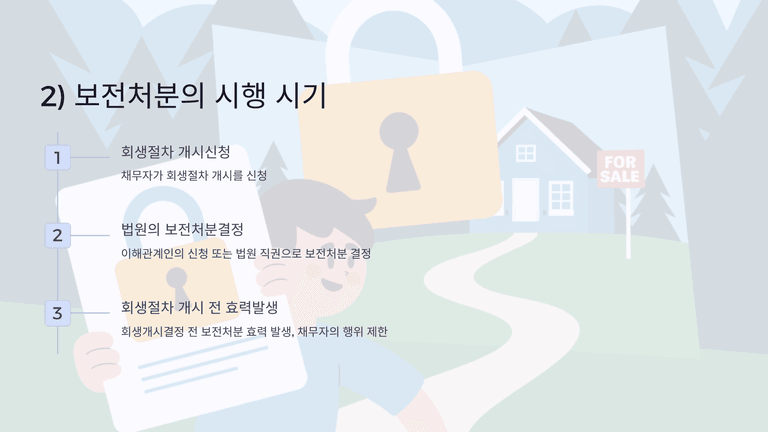 회생절차 개시신청 전 채무자의 재산 은닉이나 무분별한 처분을 막고 채권자의 개별 권리행사를 금지하기 위해 보전처분과 보전관리명령(채무자 대상), 중지·취소명령 및 포괄적 금지명령(채권자 등 제3자 대상) 제도가 있다.
