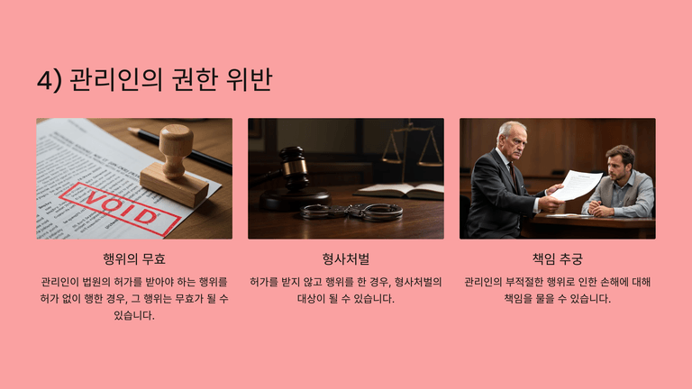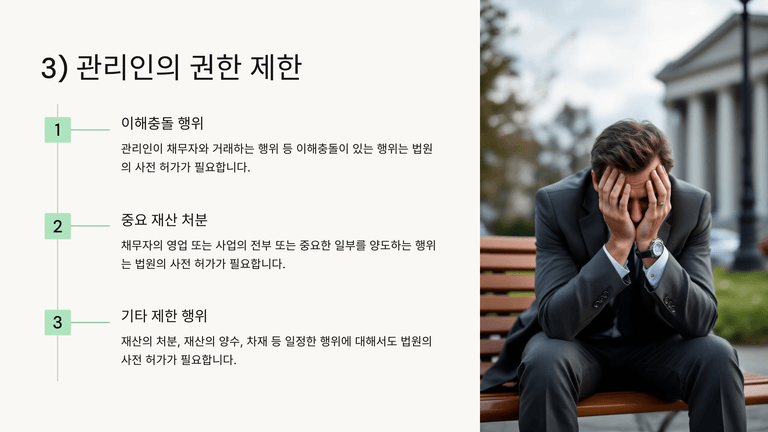 관리인은 채무자의 영업·재산을 양수하거나 채무자와 거래하는 행위, 사업의 전부 또는 중요한 일부 양도 시 법원 허가를 받아야 하며, 이를 위반하면 행위 무효 및 형사처벌 대상이 될 수 있다. 또한 채무자 재산 관련 소송은 관리인이 당사자가 되며, 소송절차는 중단되고 관련 채권조사절차가 우선 진행된다.
