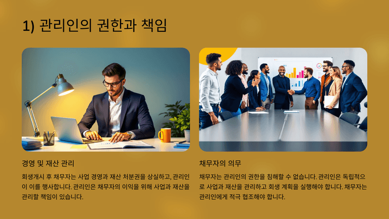 기업회생절차 중 "개시결정의 효력 - 관리인의 지위"에 대한 안내입니다.