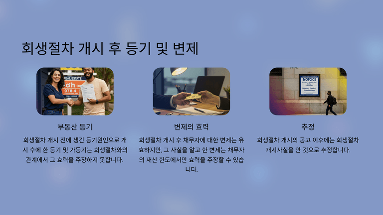 또한 회생절차 개시 후 개시 사실을 모른 채 한 변제는 유효하나, 개시 사실을 알고 한 변제는 채무자 재산 이익 범위 내에서만 효력을 인정받는다. 개시 공고 이후에는 개시 사실을 안 것으로 추정된다.