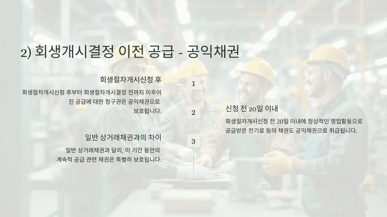 다만, 회생절차개시신청 후 개시결정 전까지 공급된 부분과 개시신청 전 20일 이내 정상 영업활동에 따른 전기료 등은 ‘공익채권’으로 보호되며, 일반 상거래채권과는 다르게 취급된다.