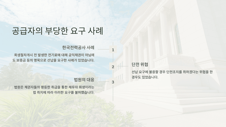 과거 한국전력공사가 회생절차개시 전 전기료를 공익채권으로 보지 않고 선납 요구하며 단전 위협을 한 사례가 있었으나, 법원은 채권자 평등과 채무자 회생 취지에 따라 이를 불허한 바 있다.