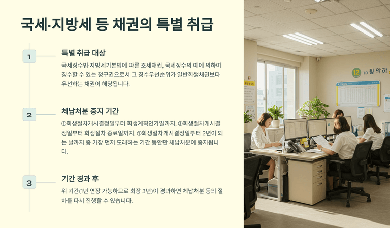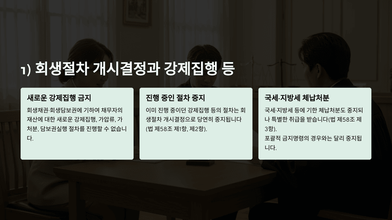 회생절차 개시결정이 있으면 회생채권·회생담보권에 기한 채무자의 재산에 대한 강제집행, 가압류, 가처분 등 절차는 새로 진행할 수 없고 이미 진행 중인 절차도 중지된다. 다만 국세·지방세 등 조세채권에 기한 체납처분은 일정 기간(최장 3년) 동안만 중지되며, 이후에는 다시 진행 가능하다.