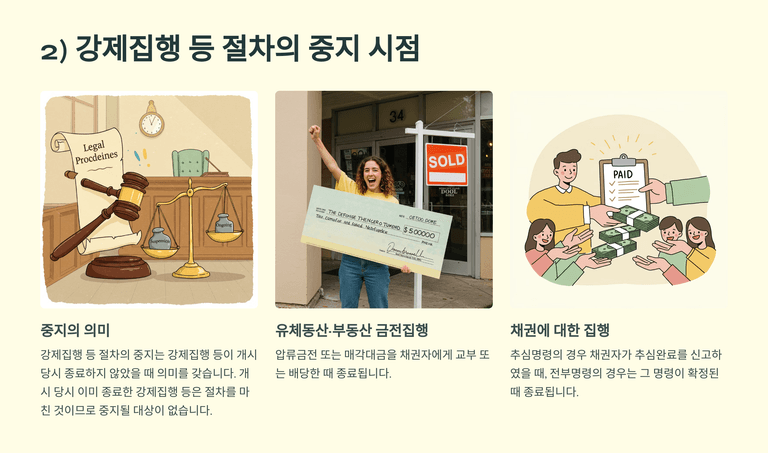 이미 종료된 강제집행 절차는 중지 대상이 아니며, 대법원은 매각대금이 채권자에게 배당되기 전 회생개시결정이 내려지면 경매절차가 중단된다고 판시했다. 중지된 강제집행과 체납처분은 회생에 필요할 경우 법원이 결정으로 취소할 수 있다.