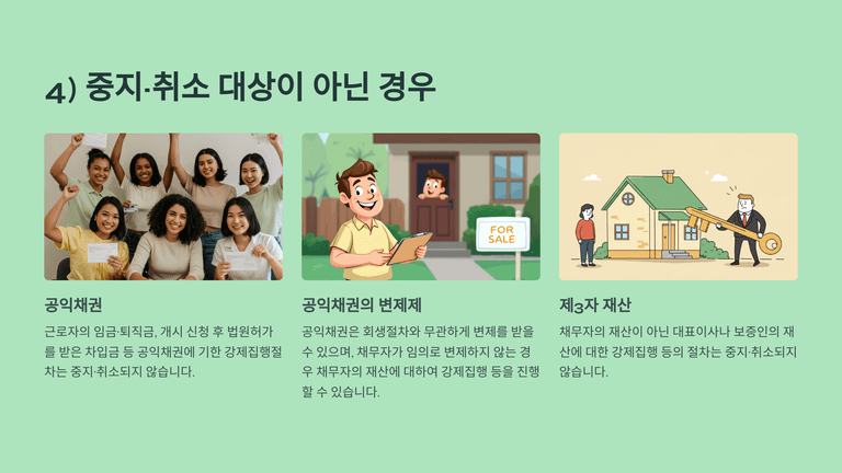 공익채권(임금, 퇴직금 등)과 채무자가 아닌 제3자의 재산에 대한 강제집행은 중지되지 않으며, 공익채권자는 회생절차와 별개로 변제 받을 권리가 있다. 법원은 회생에 지장이 없으면 관리인 또는 세무당국 신청에 따라 중지된 절차의 속행을 명할 수 있다.