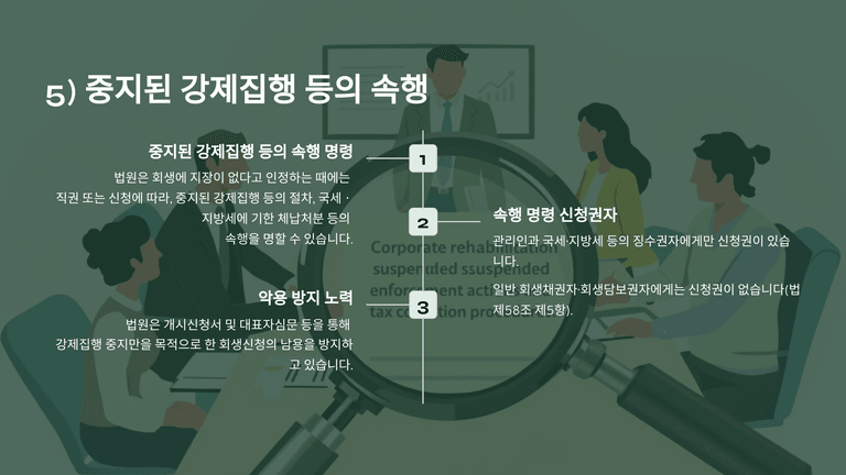 일부 채무자가 강제집행 중지만을 목적으로 회생개시신청을 하는 악용 사례가 있어, 법원은 신청서 및 대표자 심문 등으로 이를 방지하려 한다.