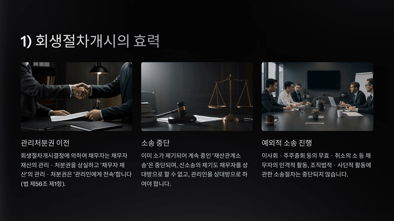 회생절차 개시로 채무자는 재산 관리·처분권을 상실하고 관리인에게 전속되며, 이에 따라 재산관계 소송은 중단되고 관리인을 상대방으로 하여야 한다. 다만 조직법적·사단적 활동에 관한 소송은 중단되지 않는다. 회생채권·회생담보권 관련 소송은 회생절차 내 채권조사절차를 거쳐 이의가 있는 경우에만 소송 절차를 수계하며, 공익채권 등은 즉시 수계할 수 있다.