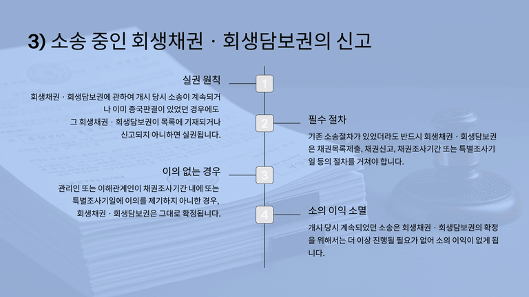 회생채권·회생담보권은 목록 제출 및 신고를 거쳐야 권리가 인정되며, 이의 제기에 따라 소송 처리 방식이 달라진다. 이의가 없으면 채권은 확정되어 소송이 더 이상 필요 없다.