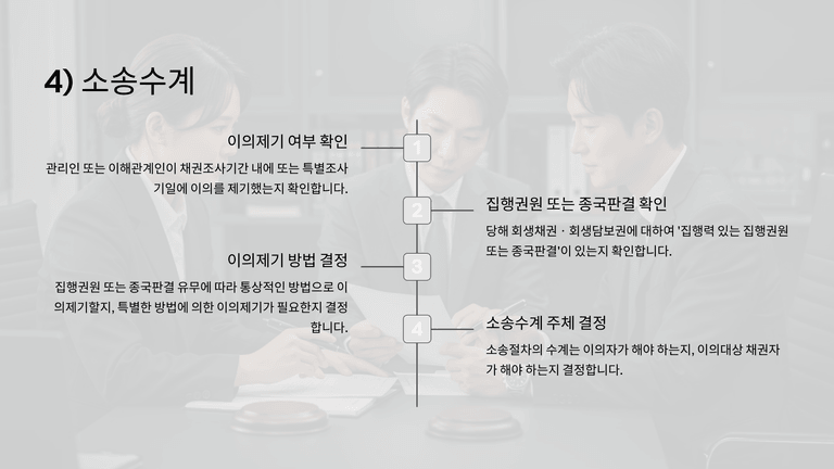 집행력 있는 판결이 없는 경우 관리인이 통상적 이의제기를 하고, 이의자가 소송 수계를 해야 한다. 반면 집행권원이나 종국판결이 있으면 이의를 제기한 자가 소송을 수계하며, 신고한 채권자가 수계하지 않는다.