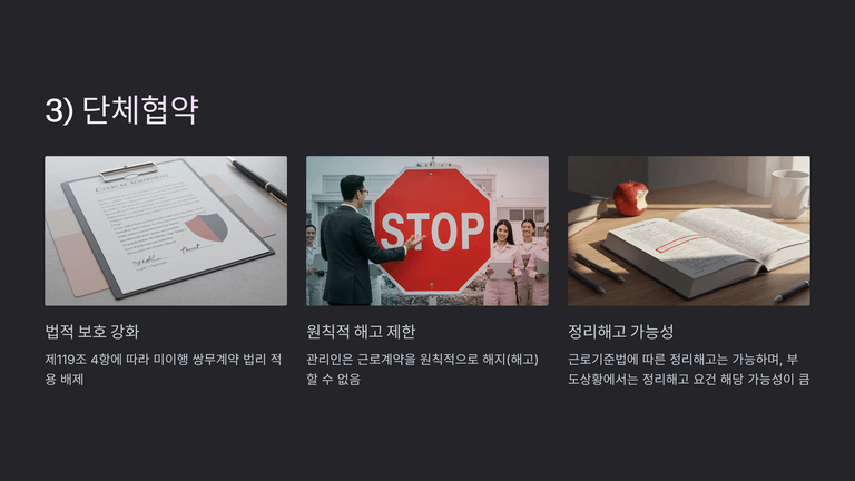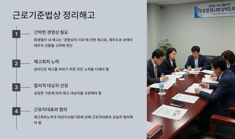 단체협약이 적용되는 경우에는 법 제119조 4항에 따라 관리인의 일방 해고 권한이 제한되나, 근로기준법에 따른 정리해고는 가능하다. 따라서 정리해고 요건 충족 여부를 신중히 검토해야 하며, 요건에 맞지 않으면 해고는 무효가 될 수 있다.