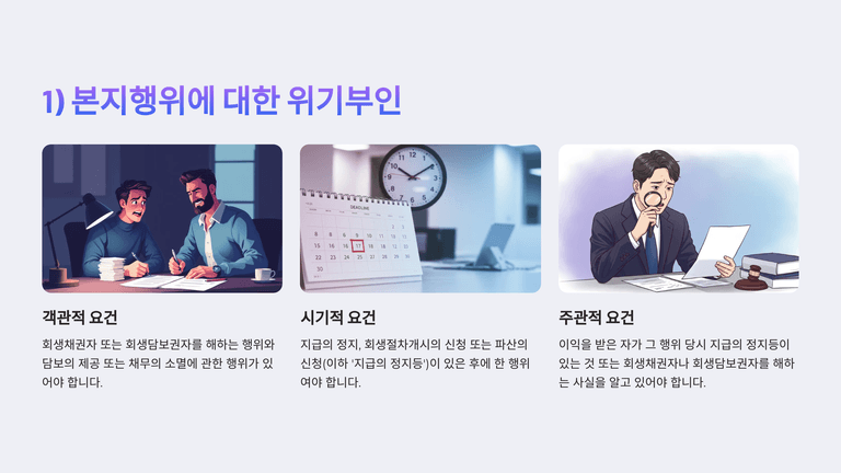 판례에 따르면 인적·물상보증도 채무자가 경제적 이익을 받지 않는 한 무상행위에 해당하며, 무상부인은 주관적 의사와 무관하게 보호가 제한된다. 지급정지 전 60일 및 6개월 내 행위에 대해 상대방 보호가 상대적으로 덜 요구된다.