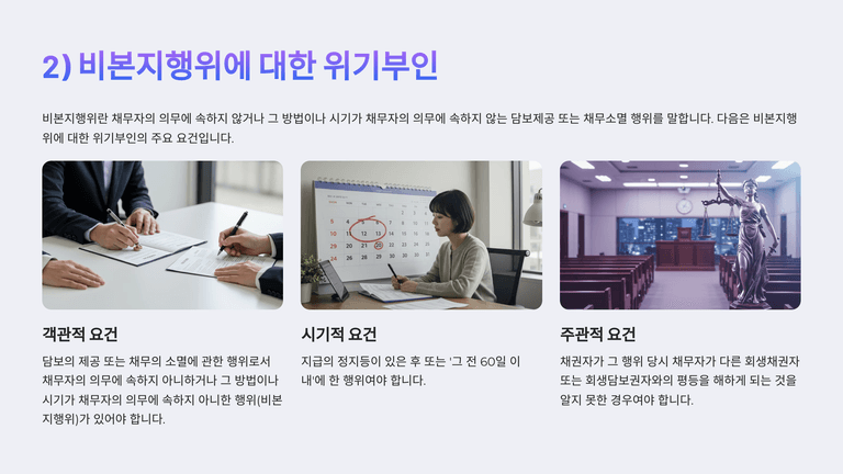 채무자회생법 제100조 제1항 제3호의 위기부인(비본지행위에 대한 위기부인)은 채무자의 의무에 속하지 않거나 그 방법·시기가 의무에 속하지 않은 행위로서 지급정지등 후 또는 그 전 60일 이내에 행해져야 하며, 상대방이 지급정지등이나 채무자의 평등 해하는 사실을 알지 못한 경우 보호된다. 구체적 담보제공 의무가 없더라도 담보 제공 시 위기부인이 될 수 있다.