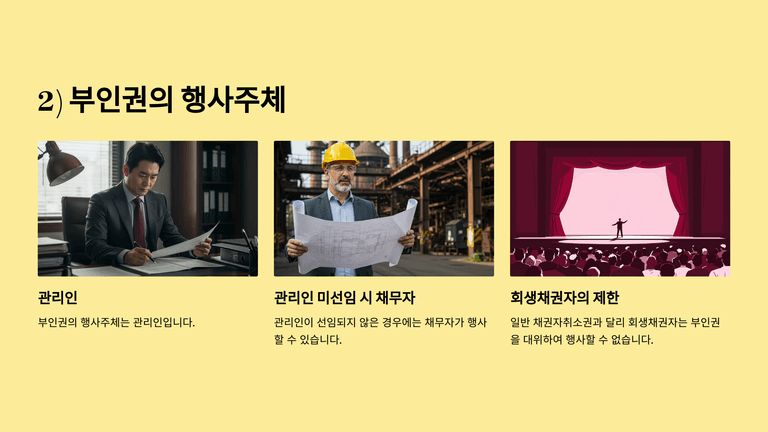 판례는 부인권이 회생절차를 전제로 관리인만 행사할 수 있는 권리로, 절차 종료 시 소멸하며 누구도 승계할 수 없다고 판단하였다(2003다18685).