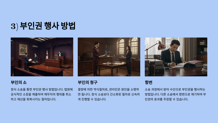 부인권은 재판상 소송, 청구, 항변으로 행사하며, 관리인이 원인을 소명하면 약식절차도 가능하다. 부인권 행사는 채무자의 재산을 원상회복시키는 효과가 있고, 재산이 멸실되었을 경우 가액배상 청구가 가능하다. 무상부인의 경우 선의 수익자도 이익 한도 내에서 상환 의무가 있다.