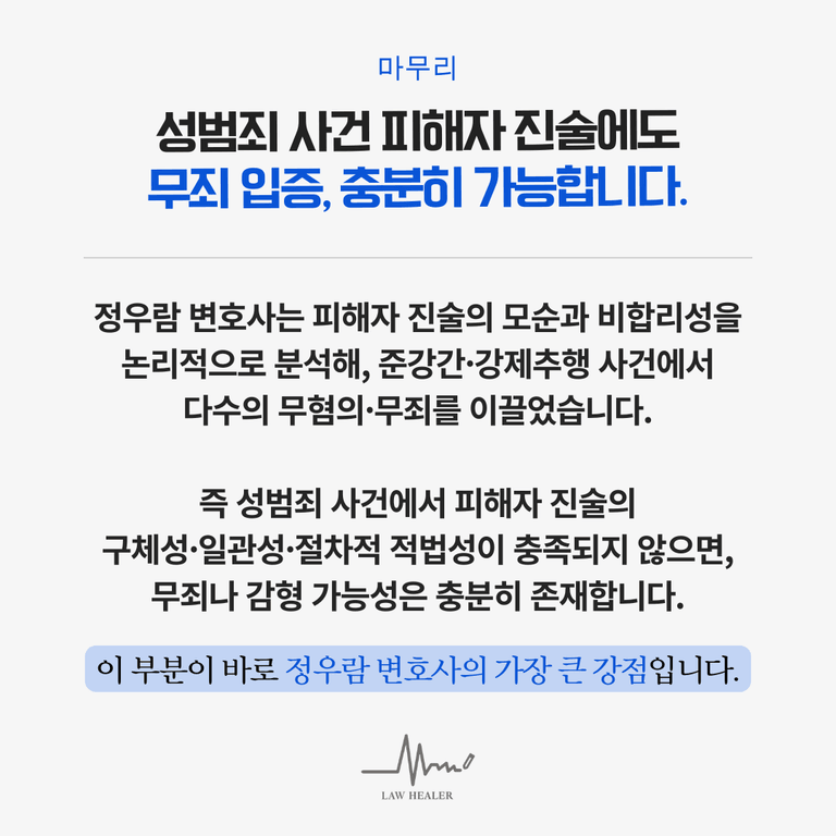 정우람 변호사는 피해자의 고통을 존중하면서도, 피고인의 인권이 침해되지 않도록 정당한 절차와 판단을 중시합니다. 진술의 신빙성을 다툰다는 것은 피해자를 인신공격하는 것이 아니라, 사실과 증거를 통해 진술의 모순점을 밝혀내는 객관적인 과정이어야 합니다.