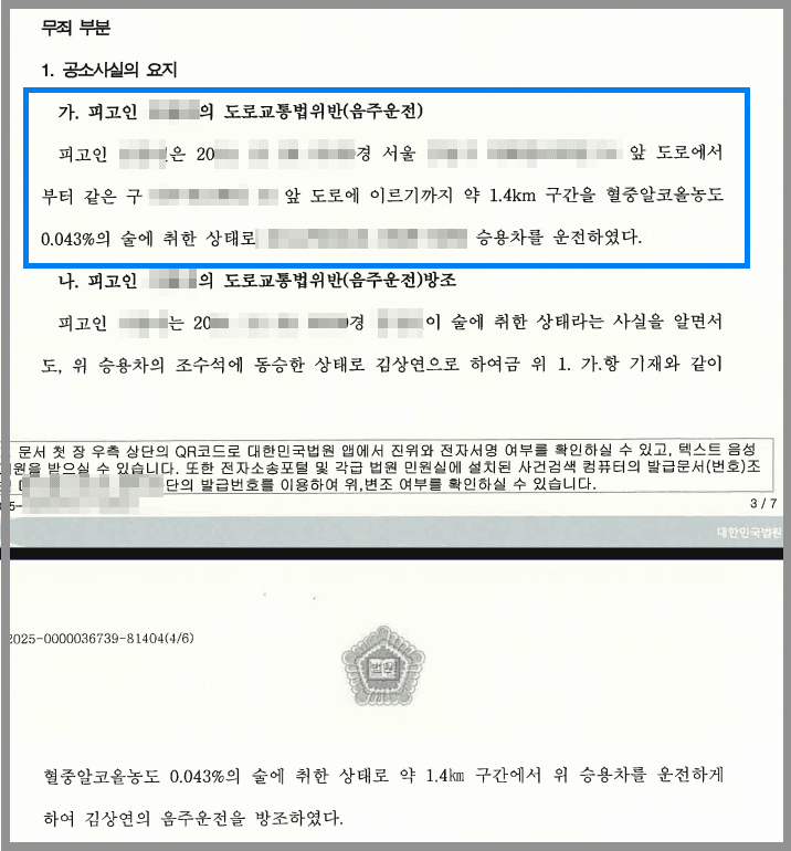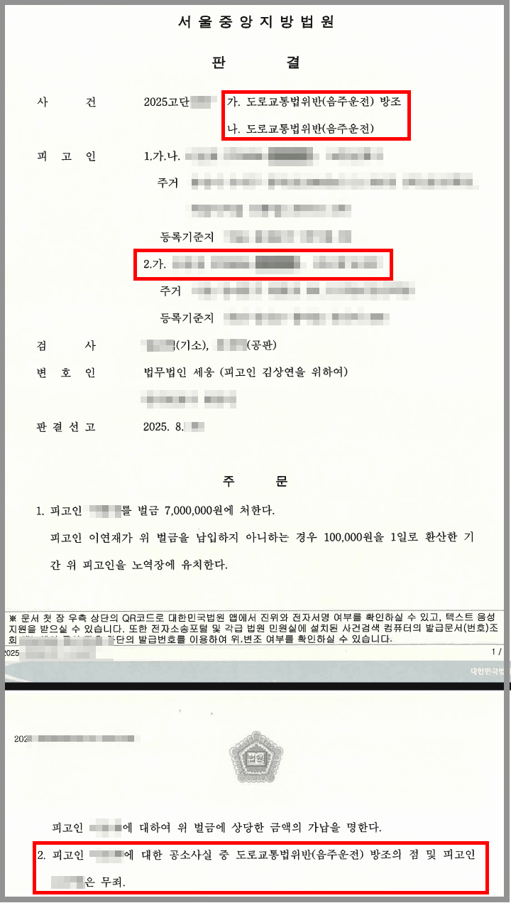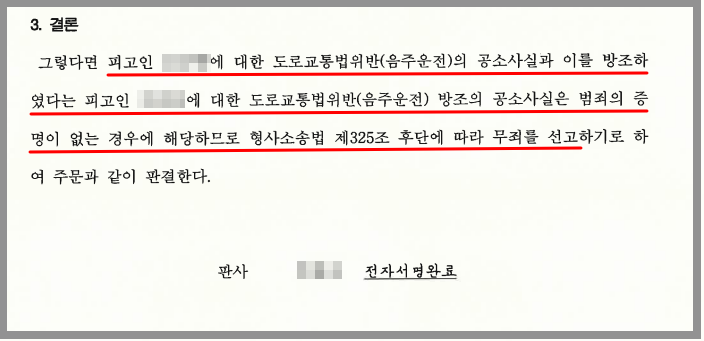 한편 A가 무죄 판결을 받음으로써 B의 혐의 중 도로교통법위반(음주운전) 방조 혐의에 대해서도 무죄가 선고되었습니다.