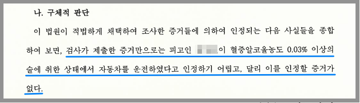 즉 무죄판결을 통해 A가 면허를 되찾는 것은 물론 형사처벌까지 면할 수 있도록 수사기관의 위드마크공식 적용에 대한 사실오인, 법리오해를 밝히는 것을 목표로 사건을 진행하였습니다.