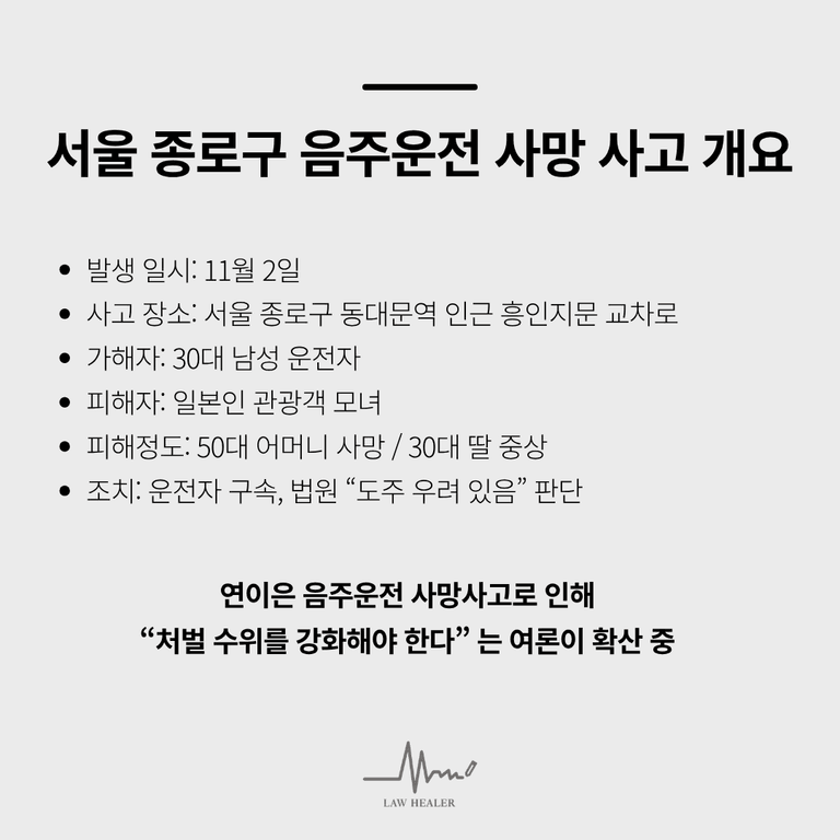 음주운전 사고는 이뿐만이 아닙니다. 불과 며칠 전인 11월 2일에도 또 다른 음주운전 차량이 일본인 관광객 모녀를 들이받는 사고가 발생했습니다. 50대 어머니는 현장에서 바로 숨졌고, 30대 딸은 중상을 입는 비극이 벌어졌습니다.