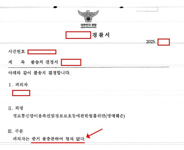 경찰 단계에서 무혐의 불송치 결정을 받았습니다.