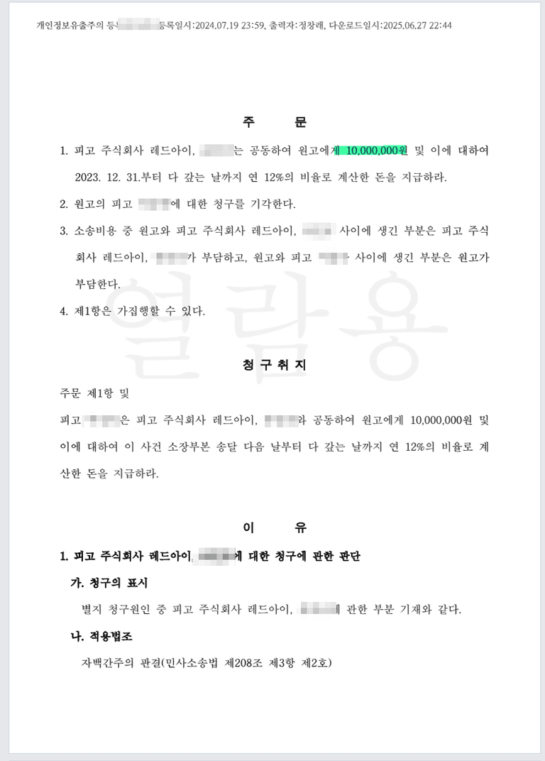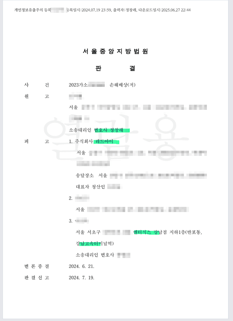 적발된 회사에 대하여 손해배상 저작권 사건 제기하여