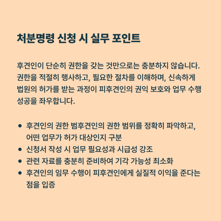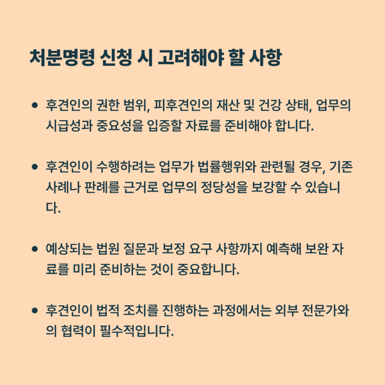 추가적으로, 처분명령은 법원이 우선적으로 검토하는 자료의 완결성에 따라 신속 인용 여부가 달라집니다. 따라서 단순히 제출 자료만 준비할 것이 아니라, 예상되는 법원 질문과 보정 요구 사항까지 예측해 보완 자료를 미리 준비하는 것이 중요합니다. 이를 통해 기각이나 추가 보정으로 인한 지연을 최소화하고, 피후견인이 불필요한 피해를 입지 않도록 할 수 있습니다.