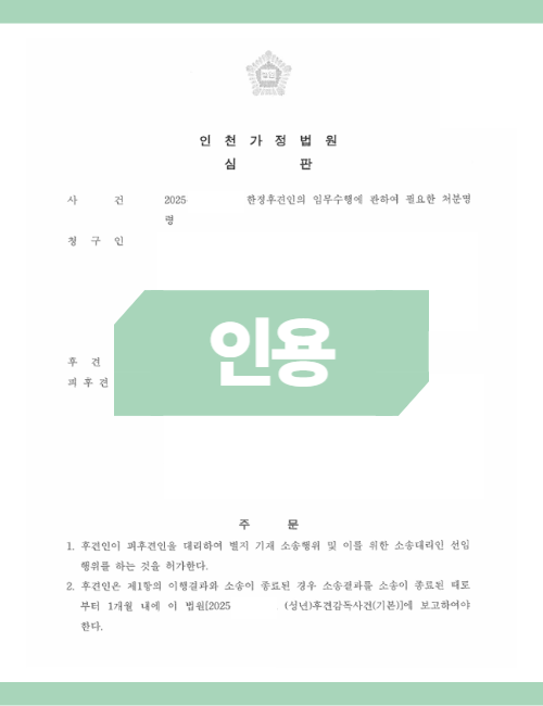 그 결과, 영업일 기준 8일 만에 처분명령 인용 결정을 받아, 후견인이 필요한 업무를 지체 없이 수행할 수 있었습니다.