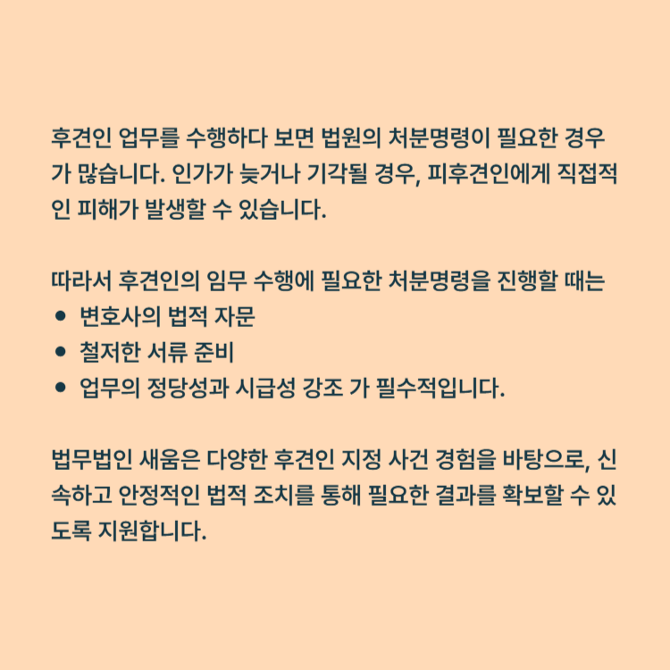 오늘은 후견인의 임무 수행과 관련해 필요한 처분명령을 신속하게 확보하는 방법과, 실제 사례를 통해 이를 어떻게 이끌어냈는지 살펴보겠습니다.