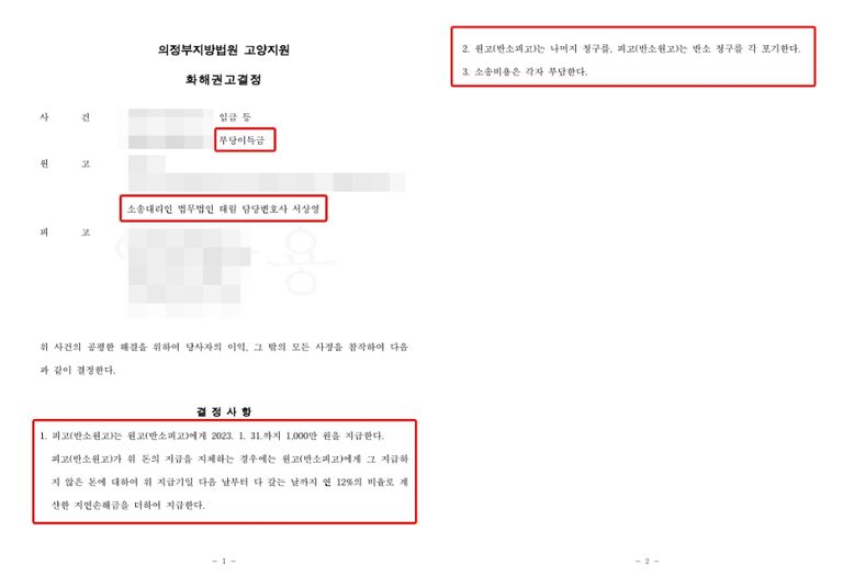 재판부는 저희 측 주장을 받아들였고, 반소를 전부 기각하며 원고가 청구한 금원의 대부분을 인용하는 화해권고결정을 내렸습니다.