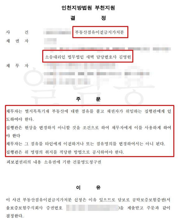 이렇게 보증서를 법원에 제출함으로써 담보 제공 요건도 충족하였고, 결국 점유이전금지가처분 인용 결정을 받아낼 수 있었습니다