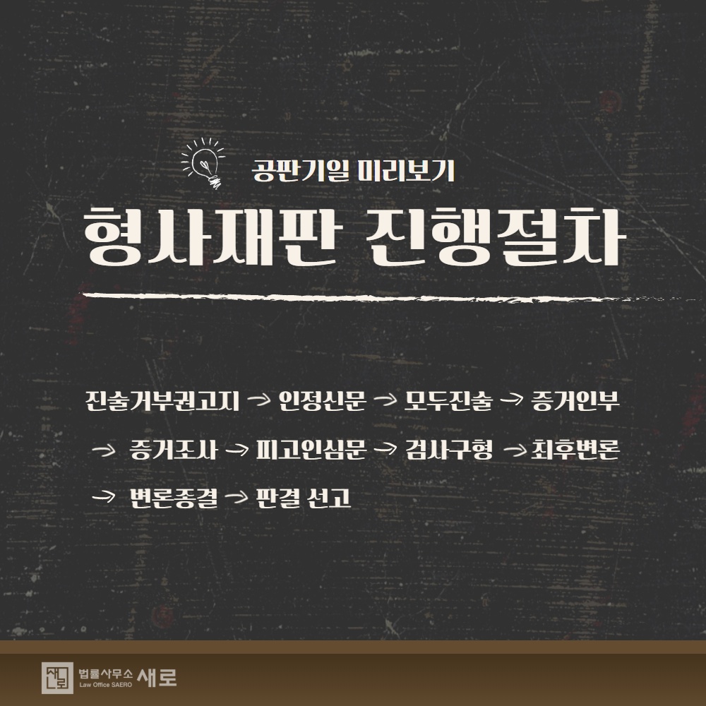 [ 진술거부권 고지 ➤ 인정신문 ➤ 모두진술 ➤ 증거인부 ➤ 증거조사 ➤ 피고인심문 ➤ 검사구형 ➤ 최후변론 ➤ 변론종결 ➤ 판결 선고 ]