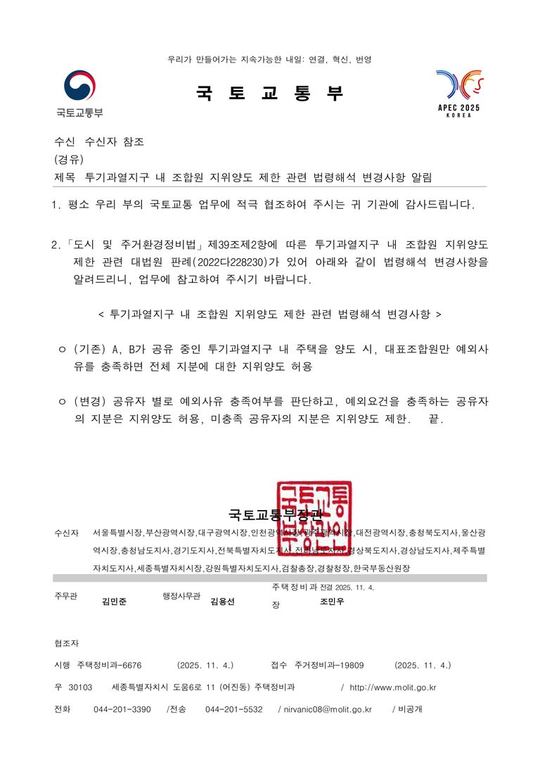 ▶️ 변경 내용: 투기과열지구 내 조합원 지위 양도 제한 판단을 공유자별로 예외 사유 충족 여부를 판단하여, 예외 요건을 충족하는 공유자의 지분 양도는 허용하고, 미충족 공유자의 지분 양도는 제한하는 것으로 해석 기준을 변경했습니다.