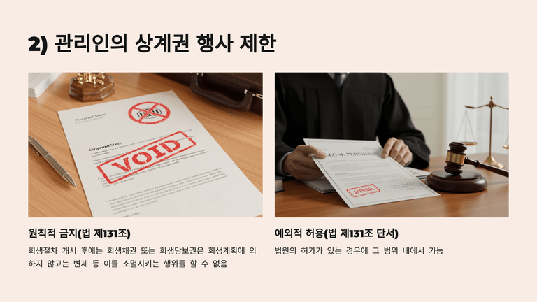 첫째, 관리인의 상계는 원칙적으로 금지되며 법원의 허가가 있는 경우에만 가능하다(채무자 재산 감소 방지 목적).