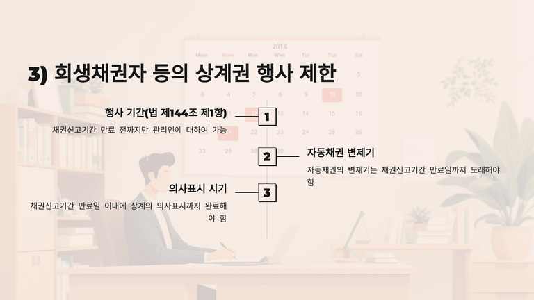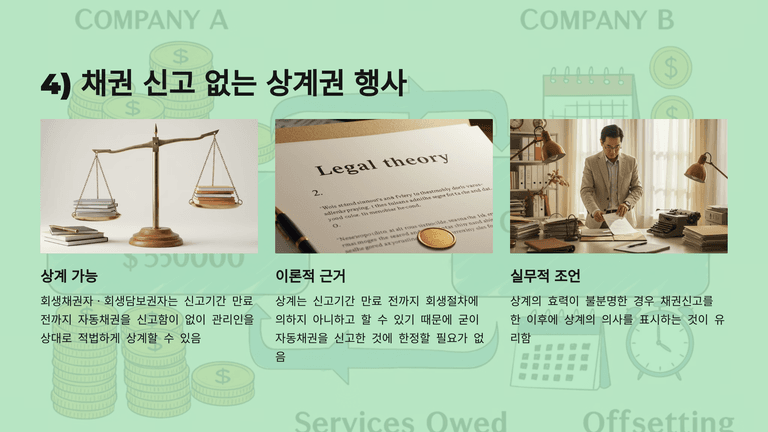 둘째, 회생채권자·회생담보권자의 상계는 채권신고기간 만료 전까지 가능하며, 자동채권의 변제기는 신고기간 내에 도래해야 한다. 상계는 신고 없이도 가능하지만 시한 내 행사되어야 하며, 추완신고한 채권은 소급하여 상계할 수 없다.