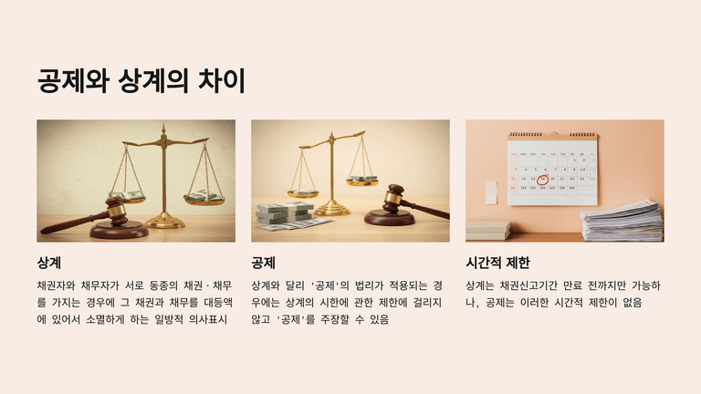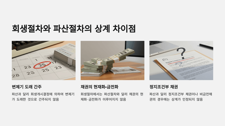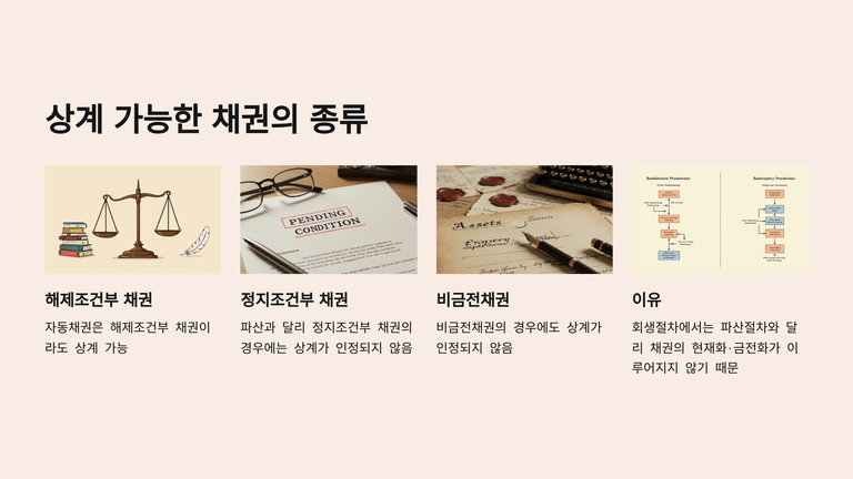 셋째, 공제와 달리 상계에는 행사기한 제한이 적용되며, 정지조건부나 비금전채권은 상계 대상이 되지 않는다(회생절차에서는 채권의 현재화·금전화가 없기 때문).