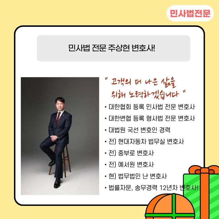 안녕하세요? 주상현 변호사입니다. 저는 대한변호사협회 등록 민사법 전문 변호사입니다.