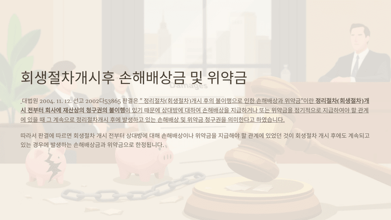 한편, 개시 후 발생한 이자, 불이행에 따른 손해배상금과 위약금, 참가비용 등도 법 제118조에 따라 회생채권으로 본다. 대법원은 회생절차 개시 전 이미 불이행 관계가 존재하고 그로 인해 계속 발생하는 손해배상·위약금도 회생채권에 포함된다고 판시했다.