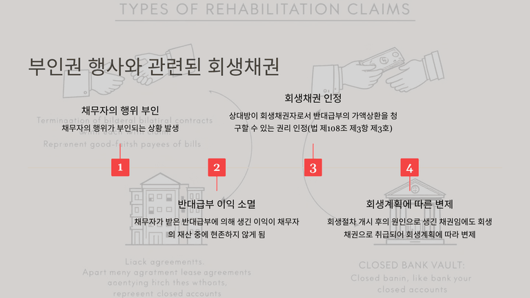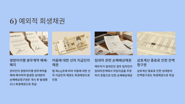 이외에도 회생개시 후 발생한 것이라도 법이 명시한 경우(예: 쌍무계약 해지로 인한 상대방 손해배상, 부인된 반대급부 가액상환청구권 등)에는 예외적으로 회생채권으로 인정된다.