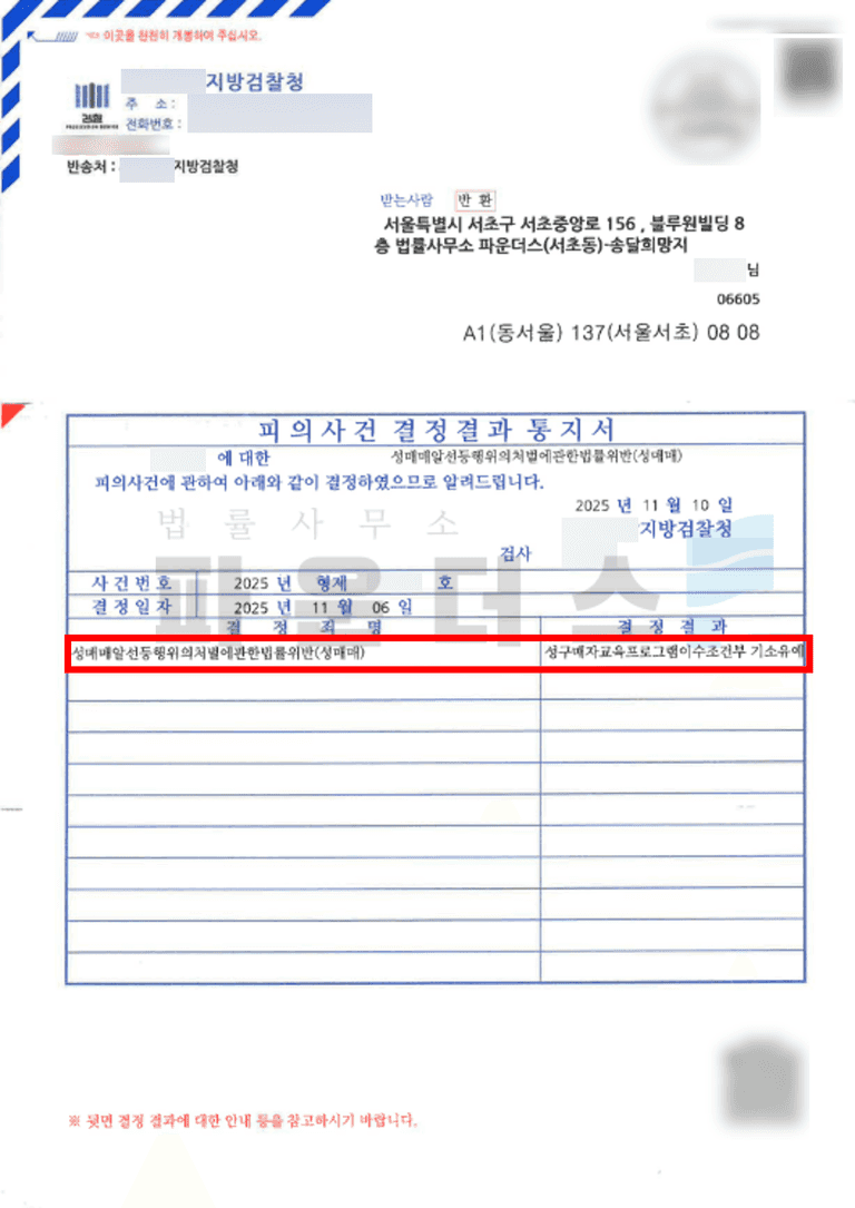 결과적으로 의뢰인은 오피스텔 성매매 현장단속에 이르러 적발된 사건에서 기소유예 처분을 받아 형사처벌을 면하고 전과 기록 위기에서 벗어날 수 있었습니다.