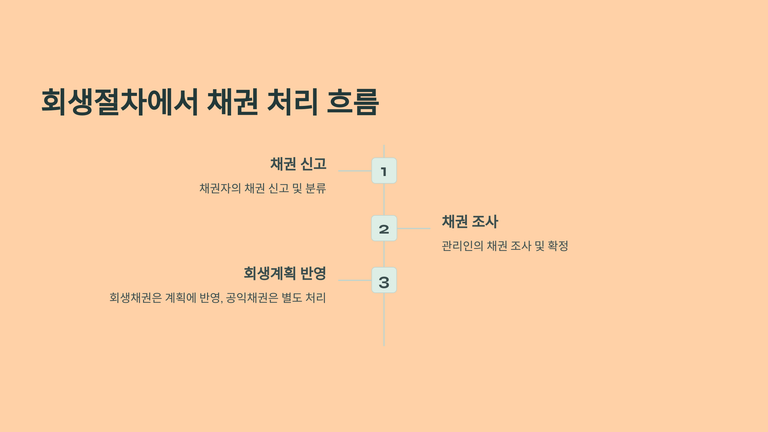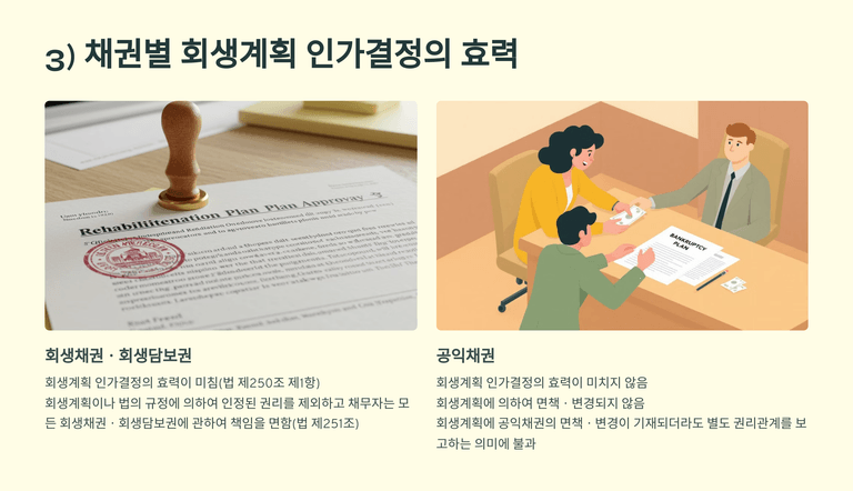 회생채권과 회생담보권은 원칙적으로 회생계획에 따라 변제되며, 회생계획 인가 전 변제를 위해서는 법원의 허가가 필요하다. 회생절차 개시로 이들 채권에 대한 강제집행은 중지되며, 회생계획 인가결정 이후에는 강제집행이 실효되고 절차가 종료될 때까지 새로운 강제집행도 제한된다.