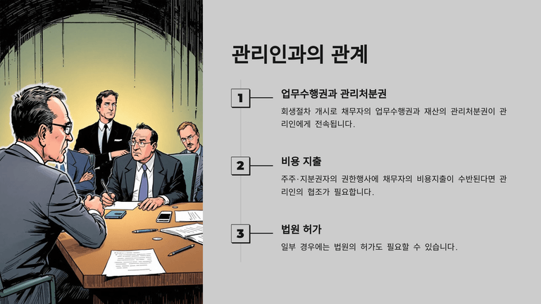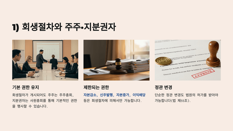 회생절차가 개시되더라도 주주나 지분권자는 주주총회·사원총회를 통해 일정 권한을 행사할 수 있으나, 자본감소·증가, 신주발행, 이익배당 등은 회생절차를 통해서만 가능하고, 정관 변경도 법원 허가가 필요해 권한이 크게 제한된다. 채무자의 업무 및 재산 관리권이 관리인에게 전속되므로 주주의 권한 행사에도 관리인의 협조나 법원 허가가 요구될 수 있다.