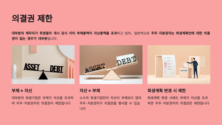 주주·지분권자는 보유한 주식 또는 지분으로 회생절차에 참가할 수 있으나, 회생절차 개시 시점에 채무자의 부채가 자산을 초과하면 의결권을 행사할 수 없다. 이는 회생계획 변경 시에도 동일하게 적용된다.