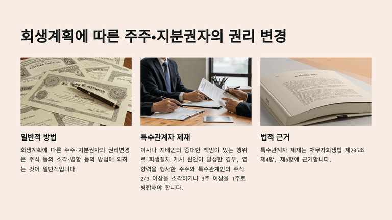 주주·지분권자는 청산절차에서는 잔여재산분배권자에 불과하므로 회생계획에서 회생채권자보다 열등하게 취급된다. 중대한 책임이 있는 주주 등에 대해서는 자본감소를 통해 강한 권리변경이 가능하며, 권리신고를 하지 않은 경우에도 회생계획상 권리는 인정되나 의결권은 행사할 수 없다.