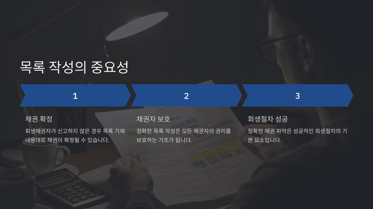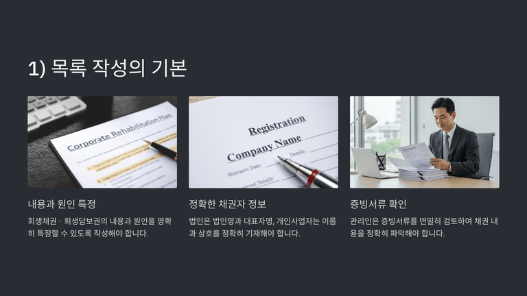 관리인은 회생채권·회생담보권 및 주주·지분권자 목록을 작성할 때 각 채권의 내용과 원인을 특정할 수 있도록 면밀히 검토하고, 증빙자료에 근거하여 채권자명, 채권내용 및 원인 등을 정확히 기재해야 한다. 특히 채권자가 별도로 신고하지 않은 경우 목록 기재 내용대로 확정될 수 있으므로 더욱 주의가 필요하다.