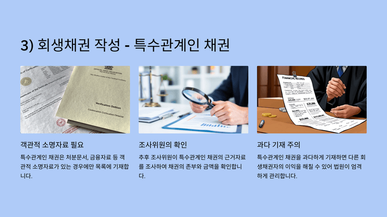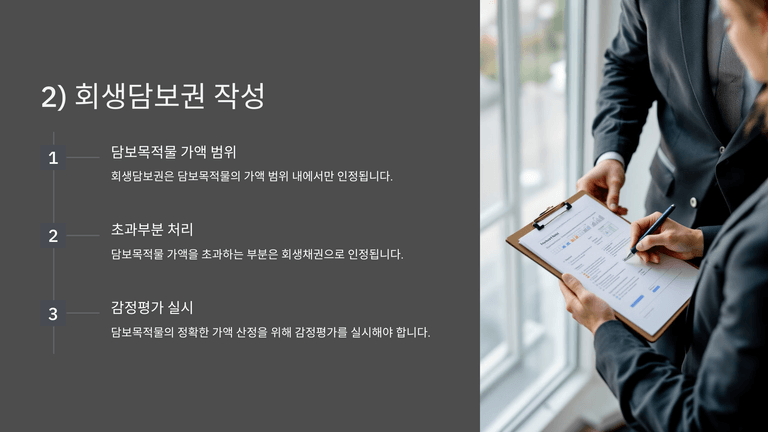 회생담보권은 담보목적물의 가액 범위 내에서만 인정되며, 초과분은 회생채권으로 처리되므로 감정평가 등의 조치를 통해 담보가액을 산정해야 한다. 특수관계인 채권은 객관적 소명자료가 있을 경우에만 기재하며, 근거가 불명확할 경우 부인될 수 있으므로 신중하게 판단한다.